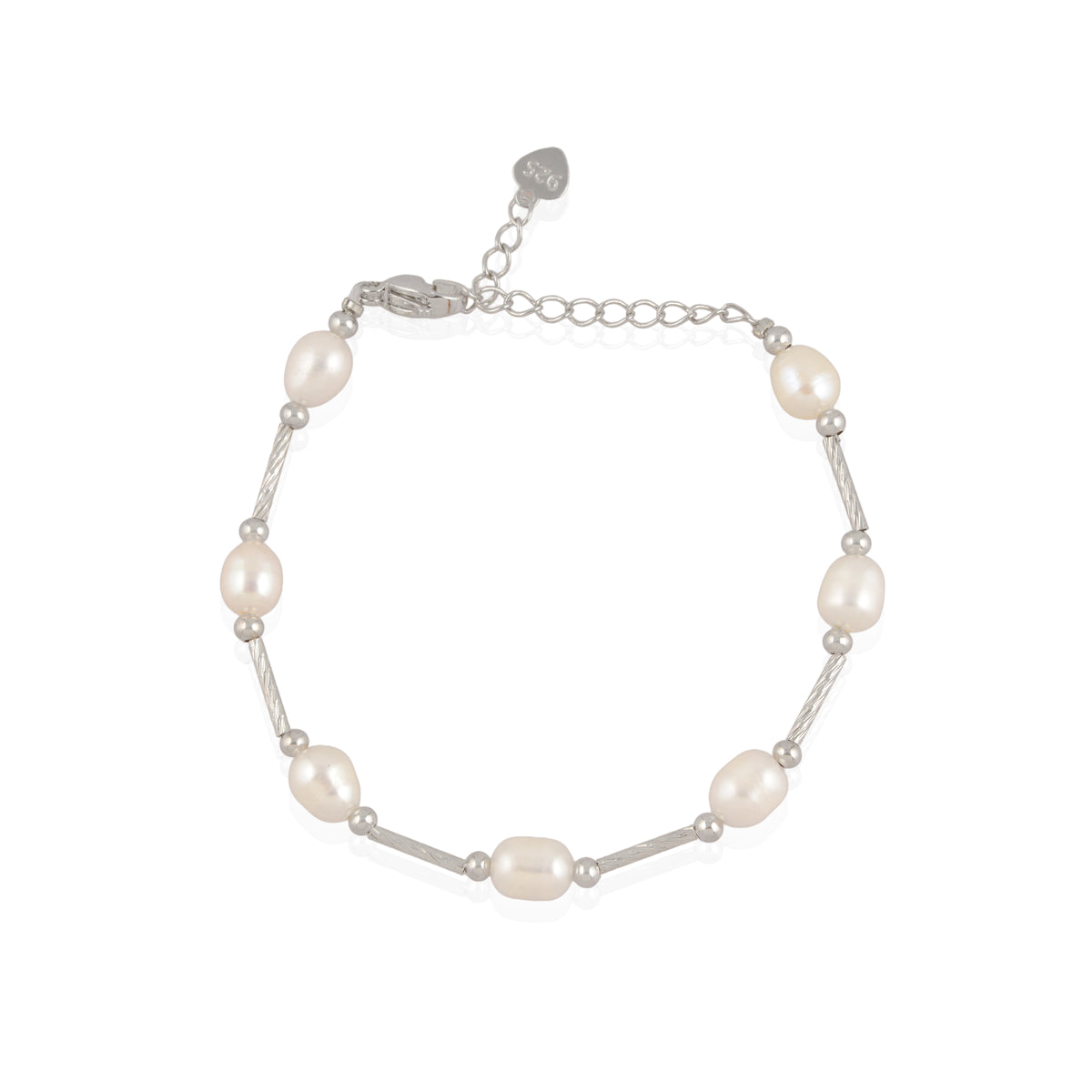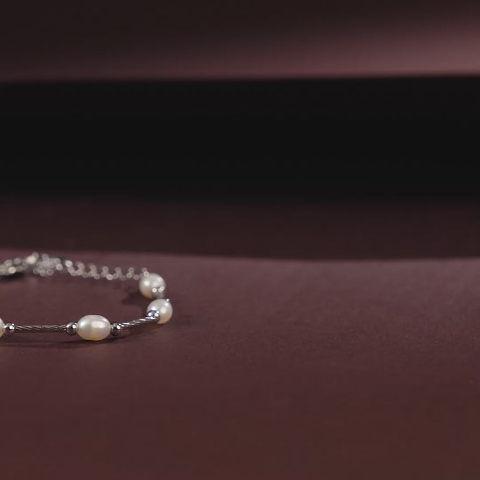 A timeless single-strand bracelet crafted with luminous freshwater pearls, delicately hand-strung to ensure fluid movement and a comfortable, graceful fit on the wrist. Each pearl is thoughtfully spaced with sleek silver elements, creating a subtle rhythm that enhances the bracelet’s refined silhouette. Finished with a secure clasp and adjustable chain detail, this piece balances classic elegance with everyday wearability. Understated yet distinctive, it is designed to complement both minimal ensembles and layered jewellery looks with effortless sophistication.