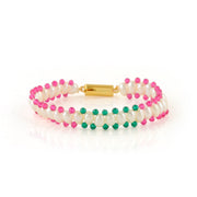 A stunning triple-layered bracelet featuring real white freshwater pearls interwoven with vibrant pink and green beads/pearls. Secured by a chic gold clip, it's perfect for adding instant color and elegance to your look.