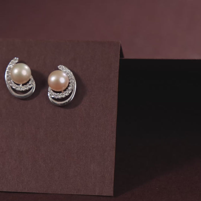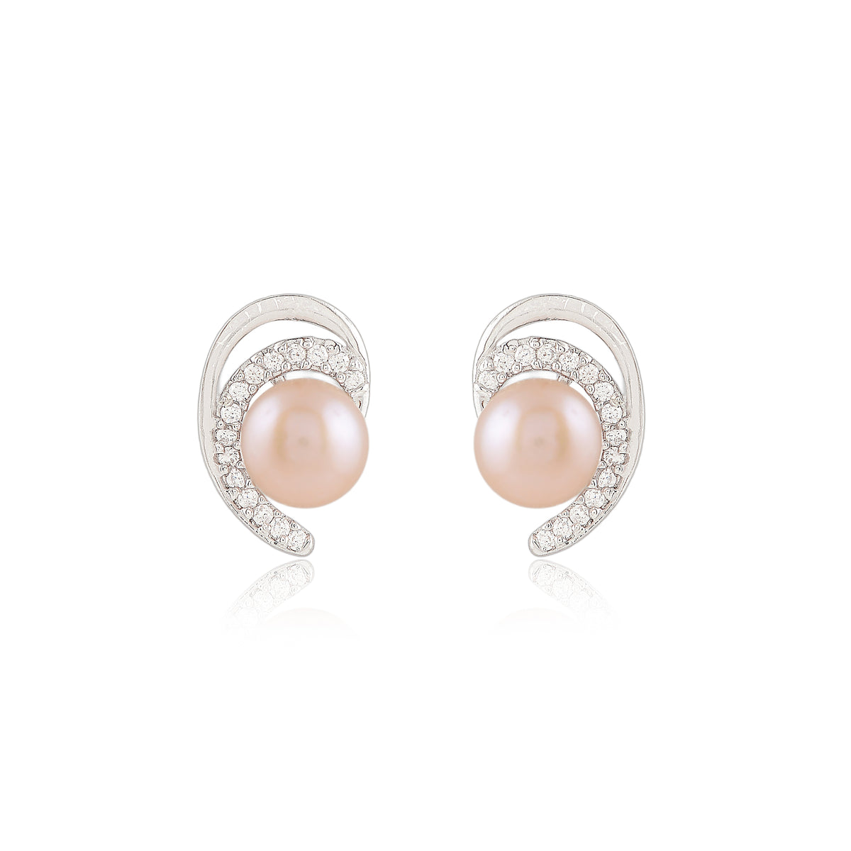 A soft pink freshwater pearl is cradled within a crescent-shaped silver form, delicately accented with subtle stone detailing. The curved silhouette adds depth and elegance while keeping the design refined and balanced. Ideal for workwear, intimate occasions, or understated festive styling, these studs bring a gentle hint of colour with a polished, contemporary finish. A versatile pair designed for everyday elegance.