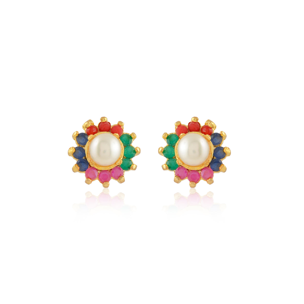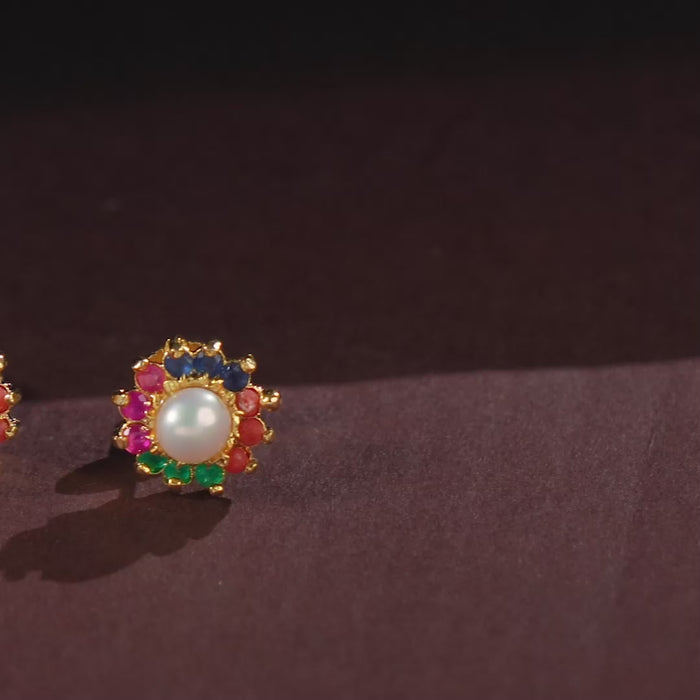 Designed to add a joyful touch of colour, these stud earrings feature a luminous freshwater pearl framed by vibrant multicolour stone accents. The circular arrangement creates a floral-inspired silhouette that feels festive yet balanced. Crafted with attention to detail, the contrast between the pearl’s soft lustre and the playful hues of the stones brings a lively elegance to the design. Perfect for festive wear, ethnic ensembles, or adding a pop of colour to everyday looks.