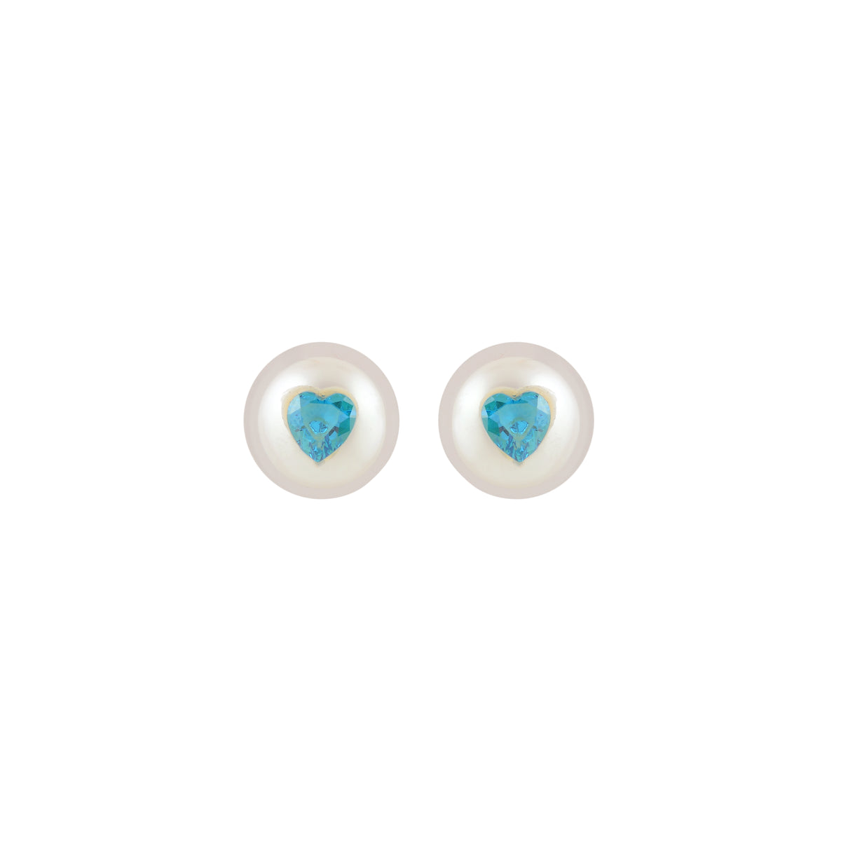 A distinctive pair of stud earrings featuring a heart cut blue cubic zirconia set at the center of a luminous round button pearl. The contrast between the faceted sparkle of the CZ and the soft glow of the pearl creates a balanced, elegant composition. Designed in a classic stud format for secure and comfortable wear, this pair brings a refined pop of color with timeless appeal.