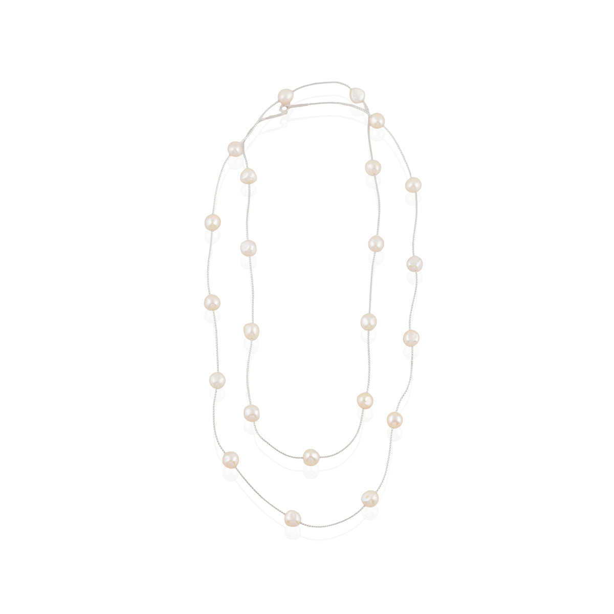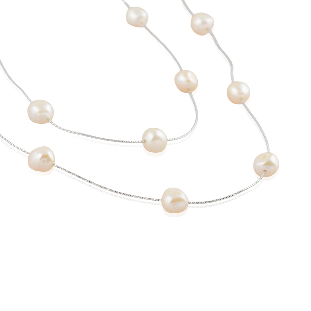 Irregular grey baroque freshwater pearls are spaced along a fine silver chain, creating a fluid station-style necklace with natural character and depth. Each pearl brings its own organic shape, making every piece subtly unique. Elegant yet understated, this necklace works beautifully for workwear, evening looks, and contemporary styling. Ideal for those who appreciate pearls in a modern, relaxed form rather than a traditional strand.
