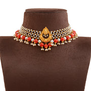 The Gold Pearl and Coral Short Necklace is a stunning piece of jewelry that features a beautiful combination of gold, pearls, and coral. The necklace is designed with a delicate gold chain that is adorned with lustrous pearls and vibrant coral beads.