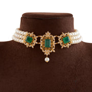 This gold pearl choker with string green pendant is a stunning piece of jewelry that combines the Pearls and color stones that will add a touch of luxury and elegance to any outfit.