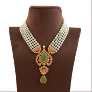 The Gold Pearl Rani Haar Necklace with Leaf Pendant is a regal and exquisite piece of jewelry that exudes luxury and sophistication. The necklace features a long and intricate gold chain that is adorned with lustrous pearls and finished with a stunning leaf-shaped pendant.
