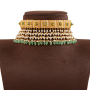 The Queenly Gold Pearls Choker is a regal and luxurious piece of jewelry that exudes elegance and sophistication. The choker features a 22K gold that is adorned with lustrous pearls, creating a classic and timeless design. The choker sits closely around the neck, making it perfect for formal occasions such as weddings or gala events.