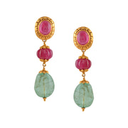 These stunning Gold Pearl Tops are adorned with rich red rubies and deep green emeralds, adding a pop of color to any outfit. The elegant combination of pearls and gold make them a timeless accessory for any occasion.
