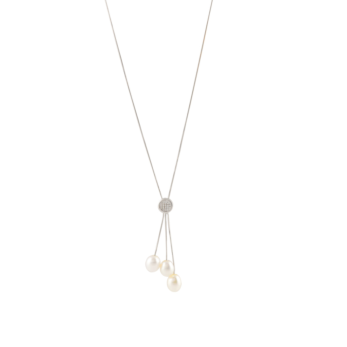 Three softly luminous pearls fall in a clean vertical line, anchored by a subtle Cubic Zirconia -detailed accent. Designed with gentle movement and balance, this piece creates a natural flow along the neckline, adding depth without feeling heavy. Minimal yet expressive, it layers smoothly with fine chains or stands out quietly on its own, offering an effortless sense of polish and softness.
