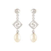 Elevate your professional style with these sophisticated silver long drop earrings. Each earring features a lustrous real freshwater pearl, gracefully suspended from a unique geometric design. The subtle sparkle of white stones, though not explicitly visible in detail, enhances the overall elegance. Lightweight and comfortable, these earrings are an ideal choice for adding a refined touch to your office attire or for a chic, everyday look.
