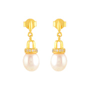 Adorn yourself with timeless elegance in these exquisite gold polish drop earrings. Each piece features a lustrous white freshwater pearl, gracefully suspended beneath a beautifully crafted cap embellished with sparkling white stones. These radiant hangings are perfect for adding a touch of sophistication to any traditional or contemporary ensemble, ideal for festive occasions or daily wear.