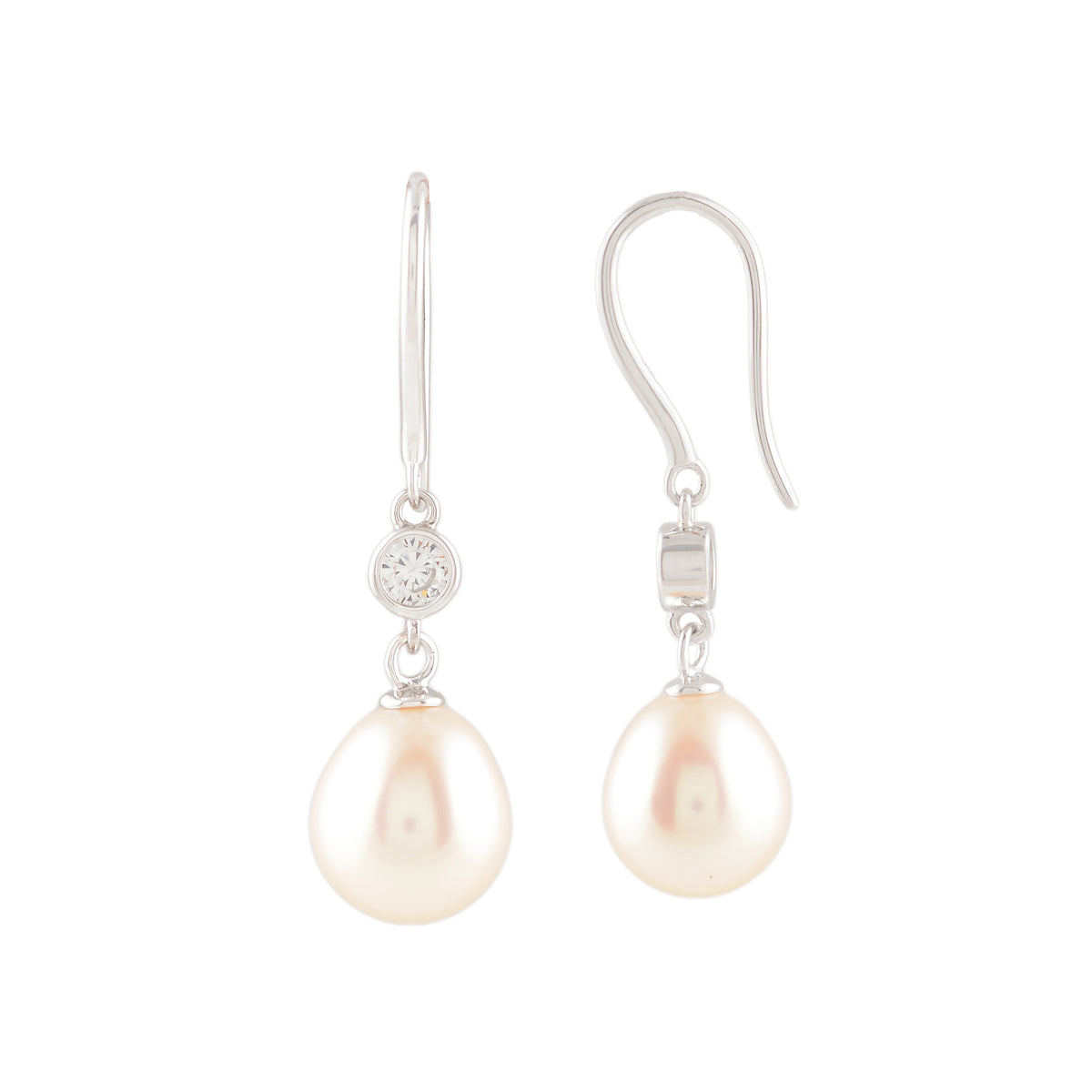 A softly luminous pearl suspended beneath a minimal silver and CZ setting, designed to highlight balance and clarity of form. The slender hook allows natural movement, letting the pearl catch light with every turn. Understated yet polished, this piece brings quiet elegance through proportion, fluidity, and timeless simplicity.