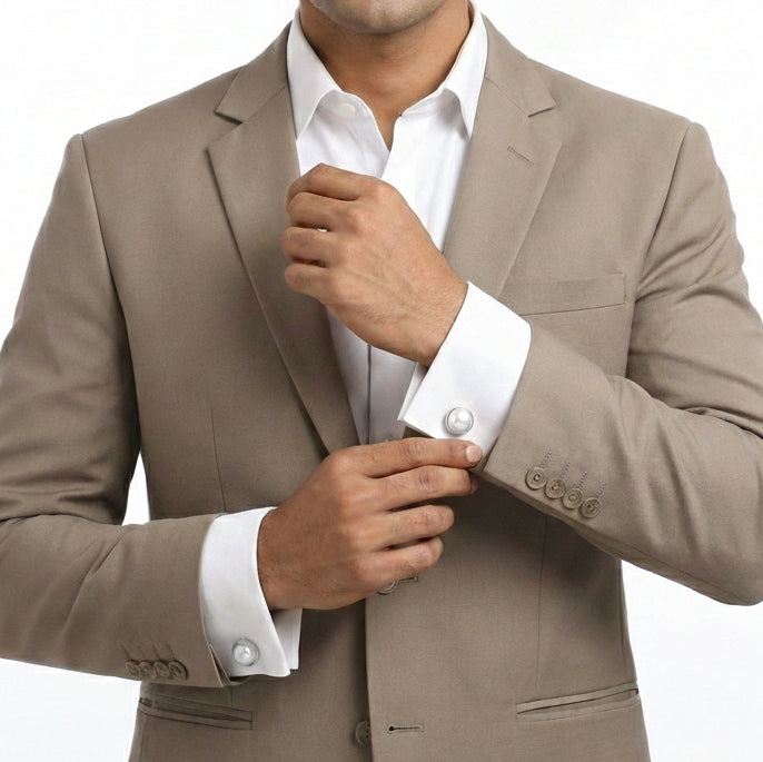 A smooth round pearl set in a clean silver frame, finished with a structured cufflink back for a secure and polished fit. The design is minimal and balanced, letting the natural sheen of the pearl stand out without distraction. Subtle yet distinctive, these cufflinks add a refined touch while staying understated and timeless.