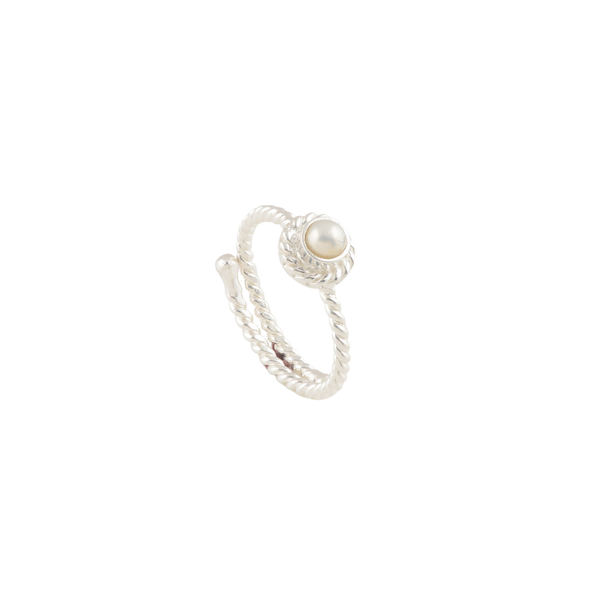 A single pearl set into a finely twisted silver band, creating subtle texture and depth without feeling heavy. The rope-like detailing adds structure to the design while keeping the look light and wearable. Simple, balanced, and quietly refined, this ring works effortlessly on its own or layered with other minimal bands.