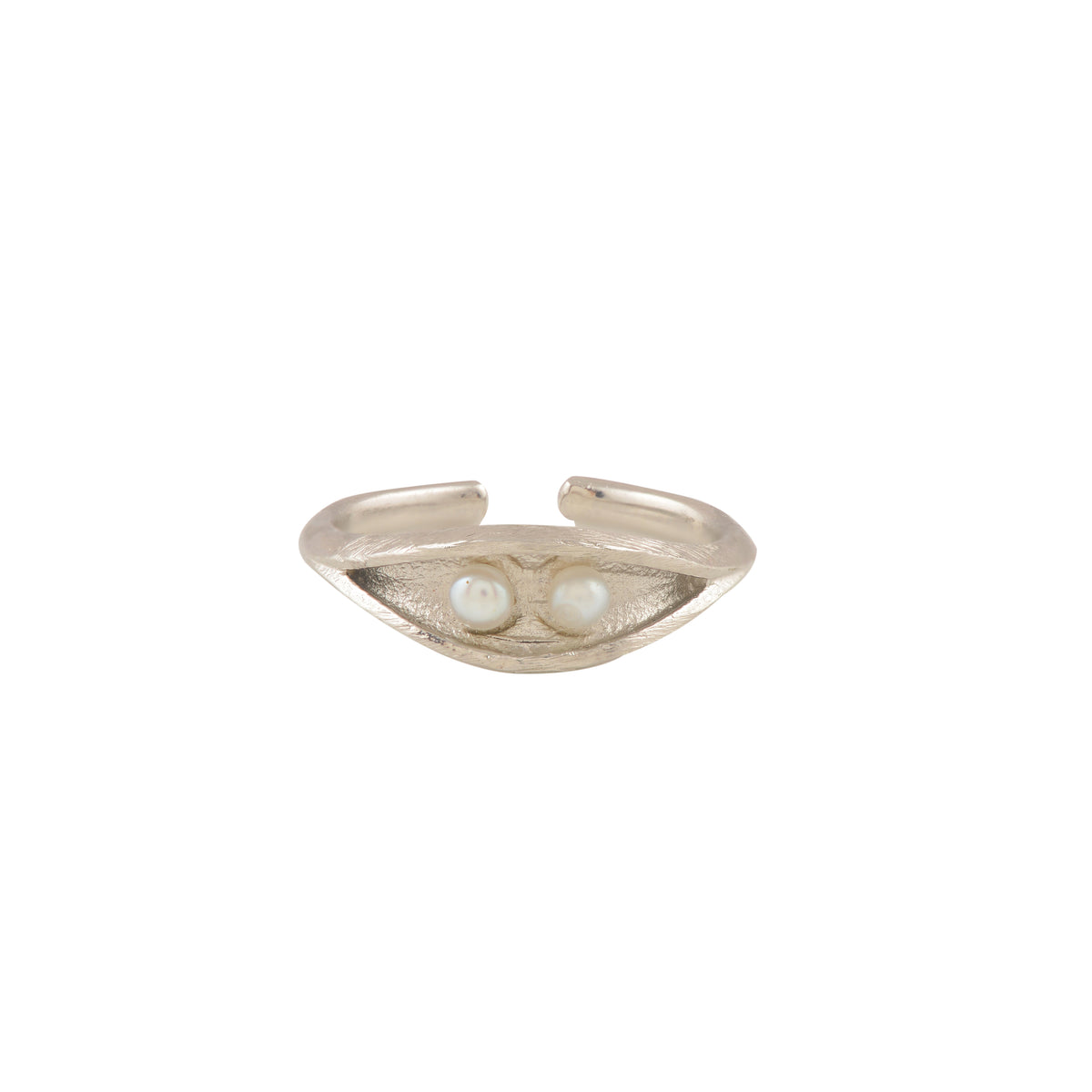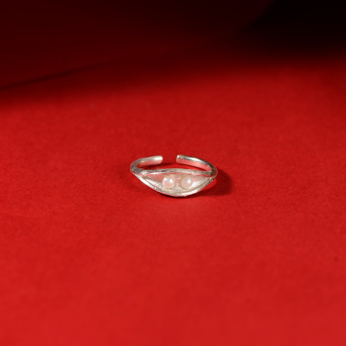 Two smooth pearls rest within a gently contoured silver band, shaped to follow the natural line of the finger. The open form gives the ring a light, modern feel, while the subtle texture adds quiet depth without distraction. Balanced and unfussy, this piece brings a polished finish that feels intentional yet effortless when worn alone or stacked.