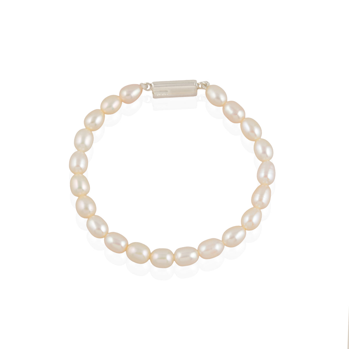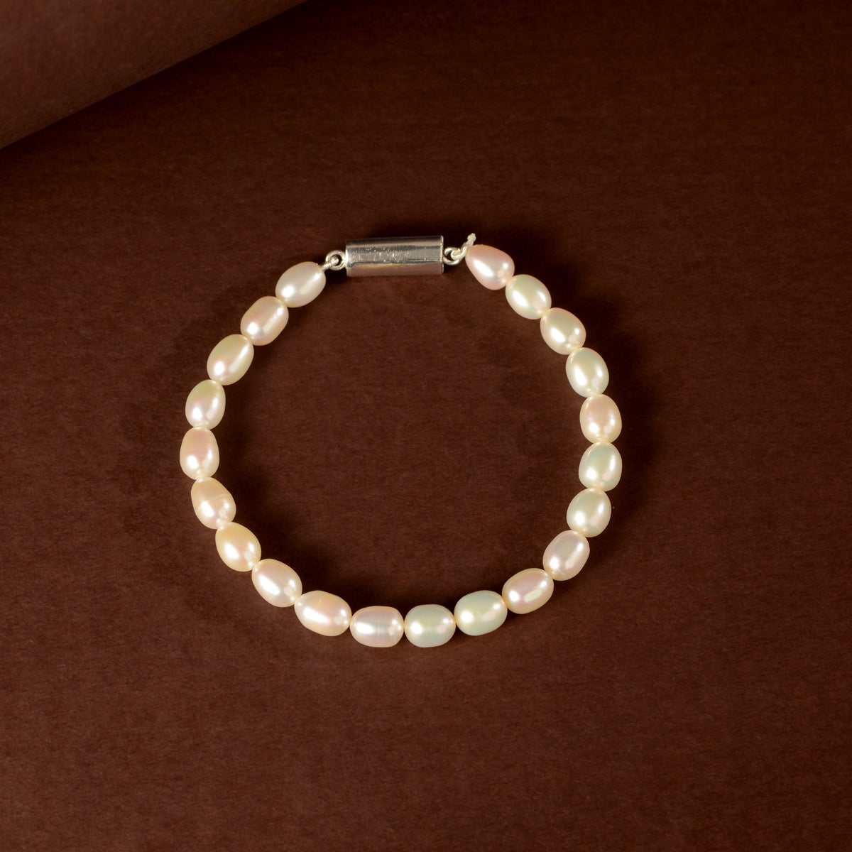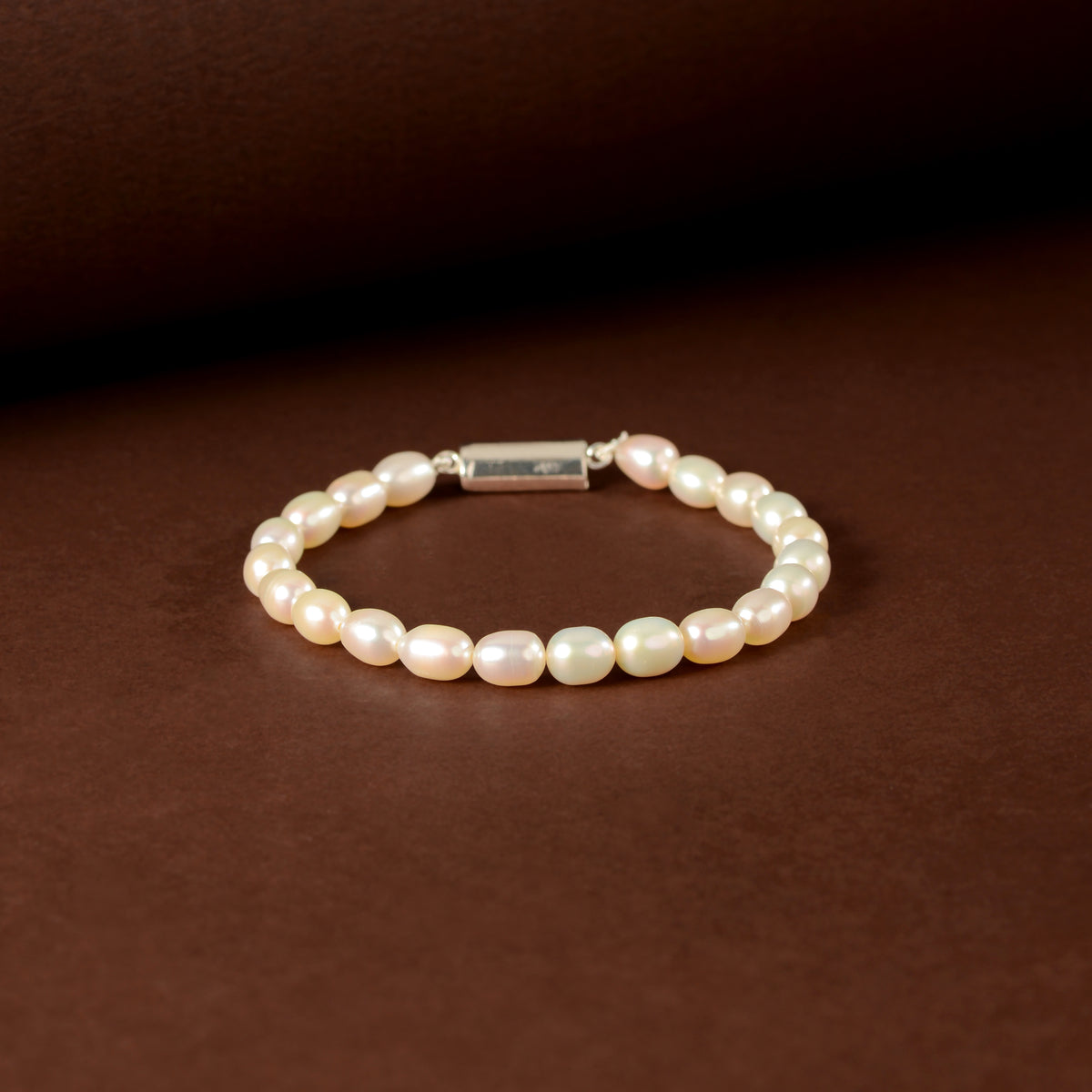 A timeless bracelet crafted with luminous white freshwater pearls, carefully hand-strung to create a smooth, continuous flow around the wrist. Each pearl is thoughtfully matched for tone and lustre, resulting in a clean, refined silhouette that reflects understated elegance. Finished with a sleek silver clasp for secure and comfortable wear, this bracelet is designed for effortless everyday styling. Minimal yet enduring, it pairs beautifully with both traditional ensembles and modern, layered looks.