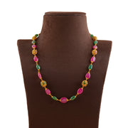 This Ruby and Emerald Gold Pearl Necklace is a sophisticated piece of jewelry that features a beautiful combination of rubies, emeralds, pearls, and gold. The necklace is designed with an elegant chain that is adorned with lustrous pearls and accented with brilliant-cut rubies and emeralds.