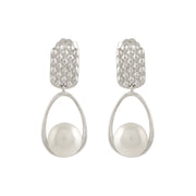 This earrings have a sparkling CZ top on a sleek 92.5 silver loop, with a shiny freshwater pearl dangling from each loop. They mix classic elegance with a modern look.