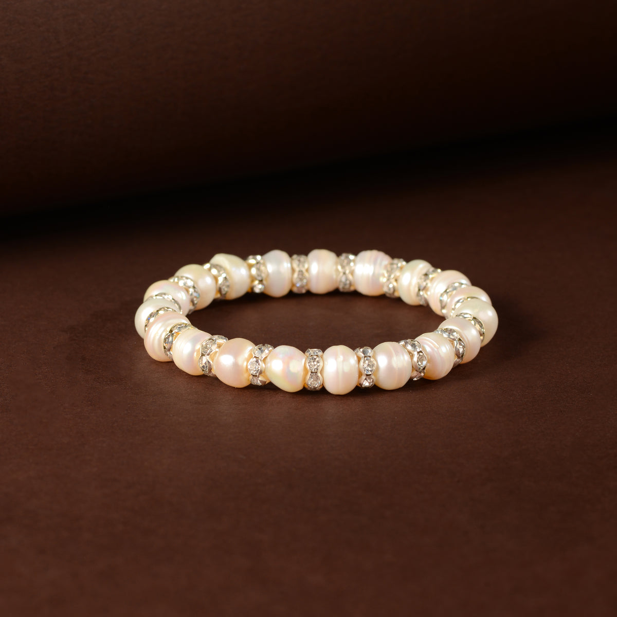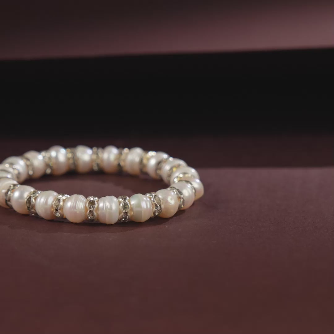 Handcrafted with luminous freshwater pearls, this bracelet is delicately strung and accented with subtle stone details that add a soft shimmer to its design. The gentle interplay of pearls and stones creates a refined rhythm, giving the piece a graceful, handcrafted character. Lightweight and comfortable, this bracelet is designed for effortless everyday wear while still offering a touch of elegance. Perfect to be worn alone or layered with other pearl pieces for a softly elevated look.