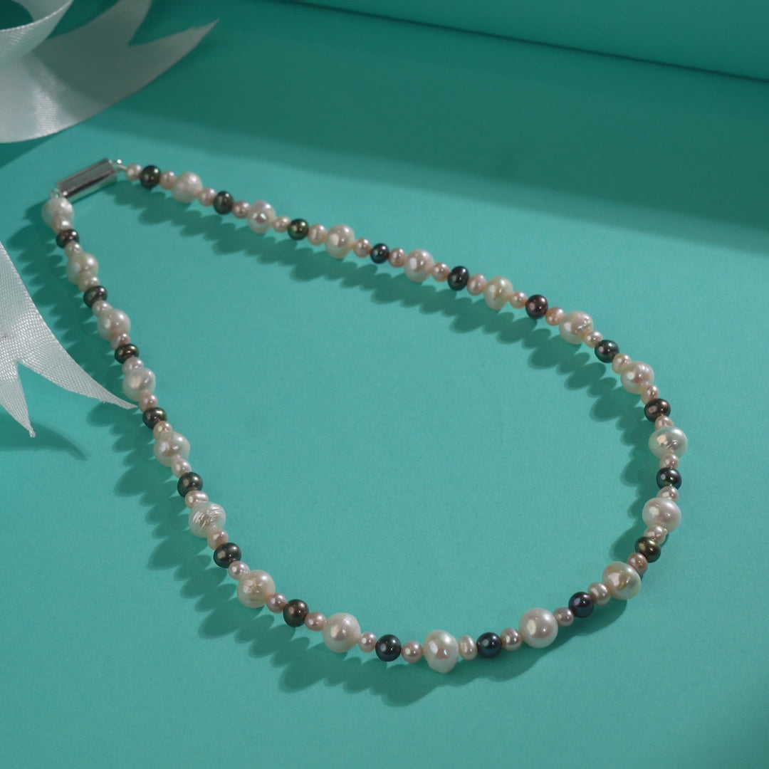 This elegant pearl necklace features a striking pattern of alternating white and black (or deep grey) round pearls, offering a modern twist on the classic pearl strand. The design creates a beautiful visual contrast, making it a highly versatile accessory that can be worn as a choker or standard necklace.