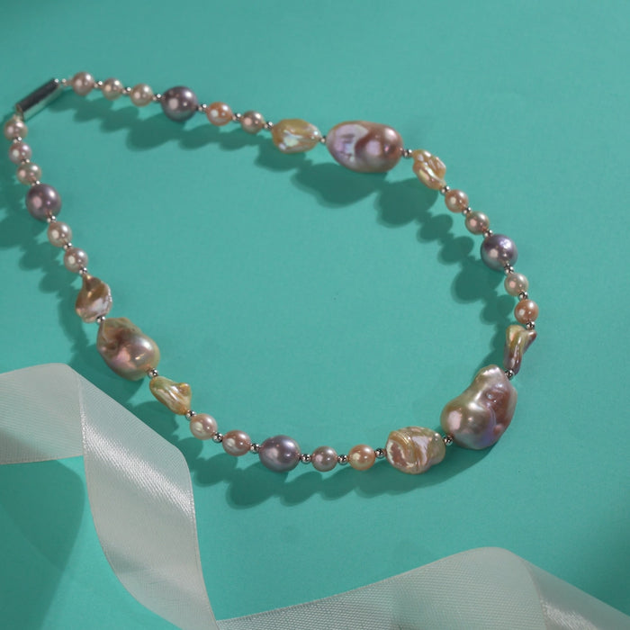 This Multicolor Baroque Freshwater Pearl Necklace features Fresh Culture Pearls in a single-line strand. The pearls range from 7–12 mm and showcase unique, irregular Baroque shapes. Their soft mix of cream, pink, and lavender/grey hues adds a modern, elegant, and versatile appeal.